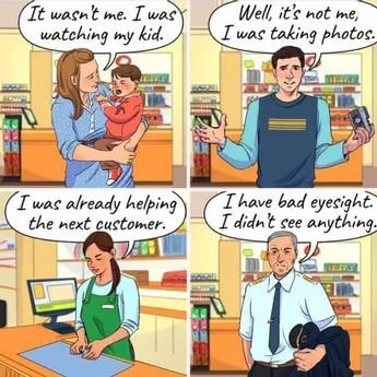 Tutto quello che dovete fare è gdare l’immagine qui sotto e identificare qe delle persone nel negozio ha rubato il portafoglio di qcuno. Tre delle persone raffigurate stanno dicendo la verità, ma una sta mentendo.