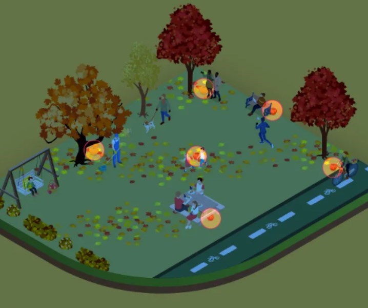 L’immagine mostra un parco giochi autunnale dove persone e bambini passeggiano. Tutti sono impegnati a fare le loro cose, ma accanto ad alcuni di loro ci sono le zucche che stiamo cercando.